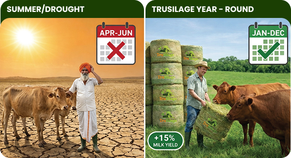 TruSilage is a pioneering agri-infrastructure venture dedicated to solving the persistent green fodder deficit through scientific innovation. We act as an ecosystem enabler, utilizing advanced high-density baling technology to bridge the gap between seasonal abundance and year-round dairy demand. By converting perishable crops into a reliable ‘fodder bank’ of lab-tested, shelf-stable silage, we de-risk dairy operations and ensure your herd thrives on Gold Standard nutrition 365 days a year.